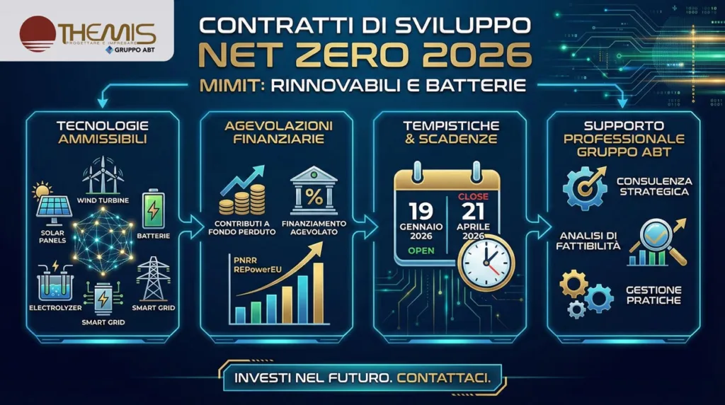In un contesto normativo così articolato e con finestre temporali così strette, l’improvvisazione non è un’opzione. Accedere ai Contratti di Sviluppo Net Zero richiede una visione d’insieme che unisca ingegneria industriale e finanza straordinaria. Gruppo ABT è strutturato per gestire esattamente questa complessità. Dal 19 gennaio stiamo già lavorando sulle prime istanze: verifichiamo la conformità del vostro piano investimenti con le nuove direttive 2026, ottimizziamo il calcolo delle agevolazioni spettanti e vi guidiamo nell’interlocuzione tecnica con il MIMIT. Il nostro obiettivo è semplice: farvi ottenere le risorse per crescere, senza intoppi burocratici.