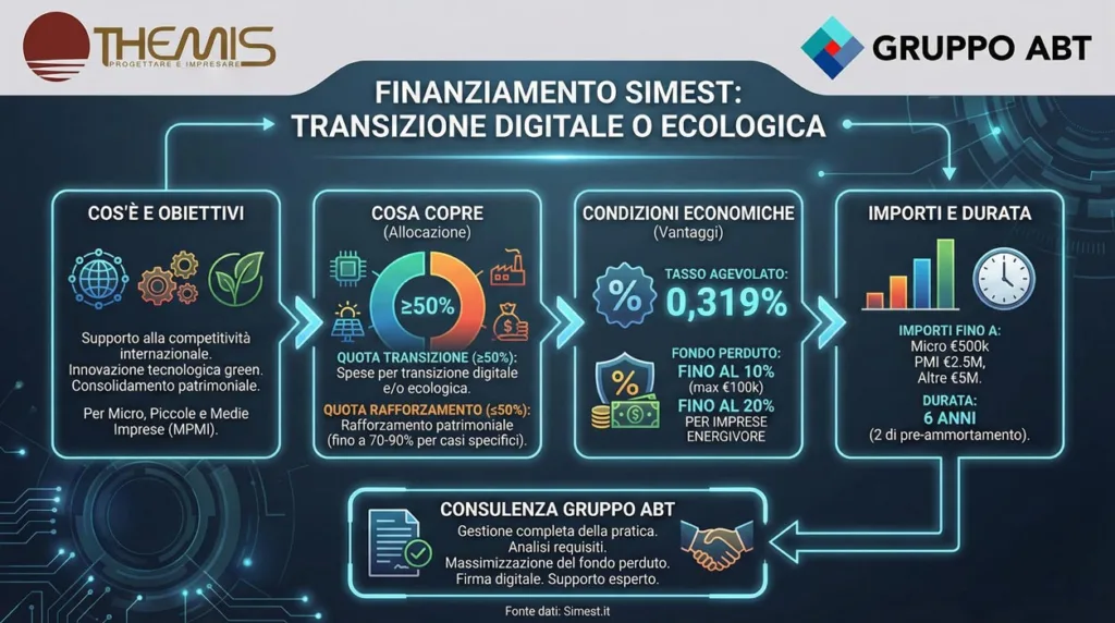 Per comprendere appieno il valore strategico di questa misura, introduciamo subito il Finanziamento SIMEST Transizione Digitale o Ecologica, uno strumento essenziale per le aziende italiane che puntano all’estero. Il Finanziamento è la soluzione agevolata disegnata per sostenere la competitività internazionale attraverso due leve fondamentali: l’innovazione tecnologica green e il consolidamento patrimoniale. Noi di Gruppo ABT siamo pronti a guidarti nell’accesso a questi fondi.